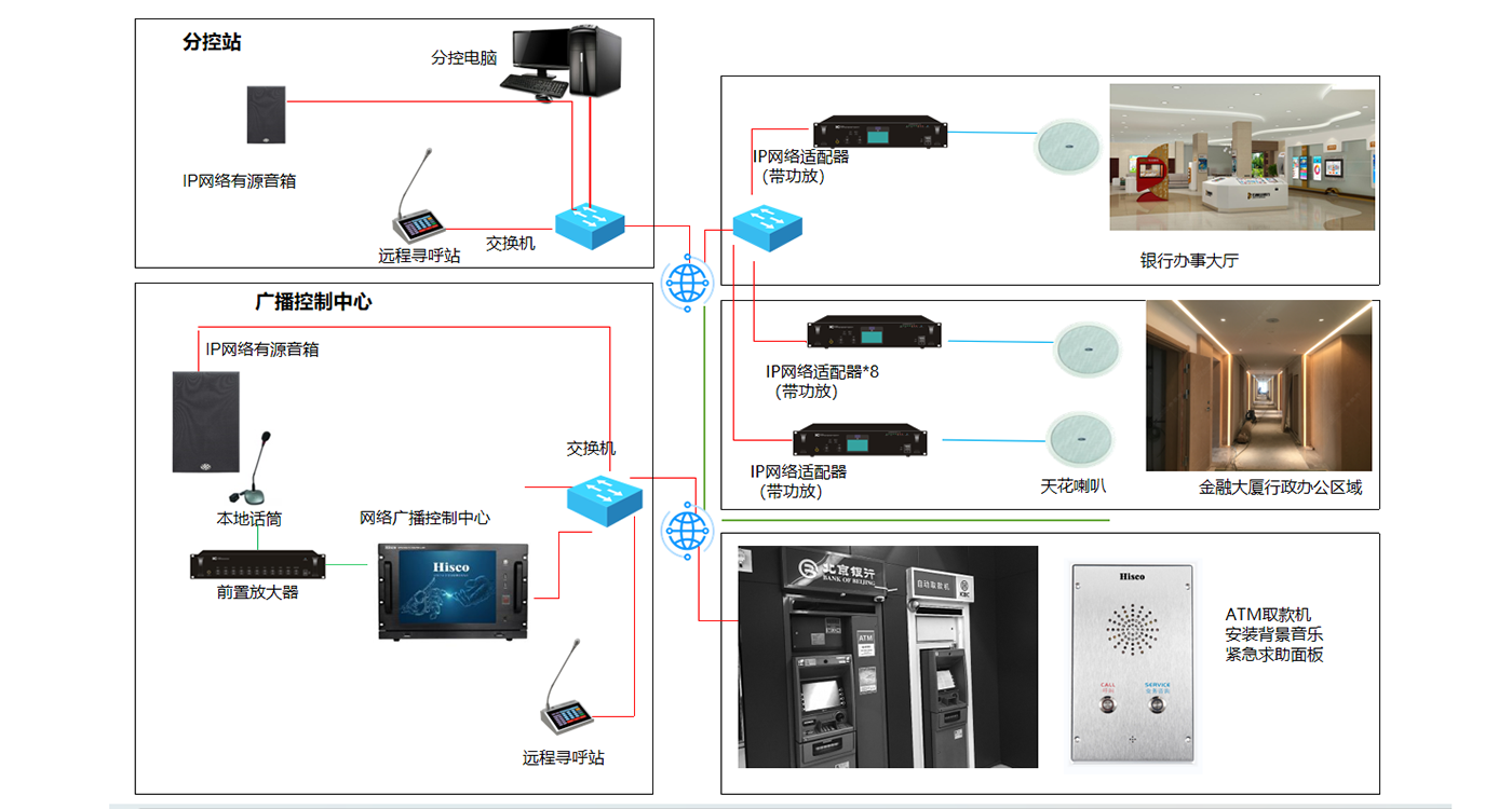 金融背景音乐系统作为金融AI智能组成部分,承担着金融大厅、行政办公区域的应急广播、高保真背景音乐播放,为行政办公区域和办事大厅营造舒适的办公环境,同时办事大厅背景音乐喇叭与排队叫号主机联动,满足办事大厅排队叫号扩声需求,在银行ATM取款机安装背景音乐紧急求助面板,实现遇到吞卡或紧急情况进行快速一键求助。