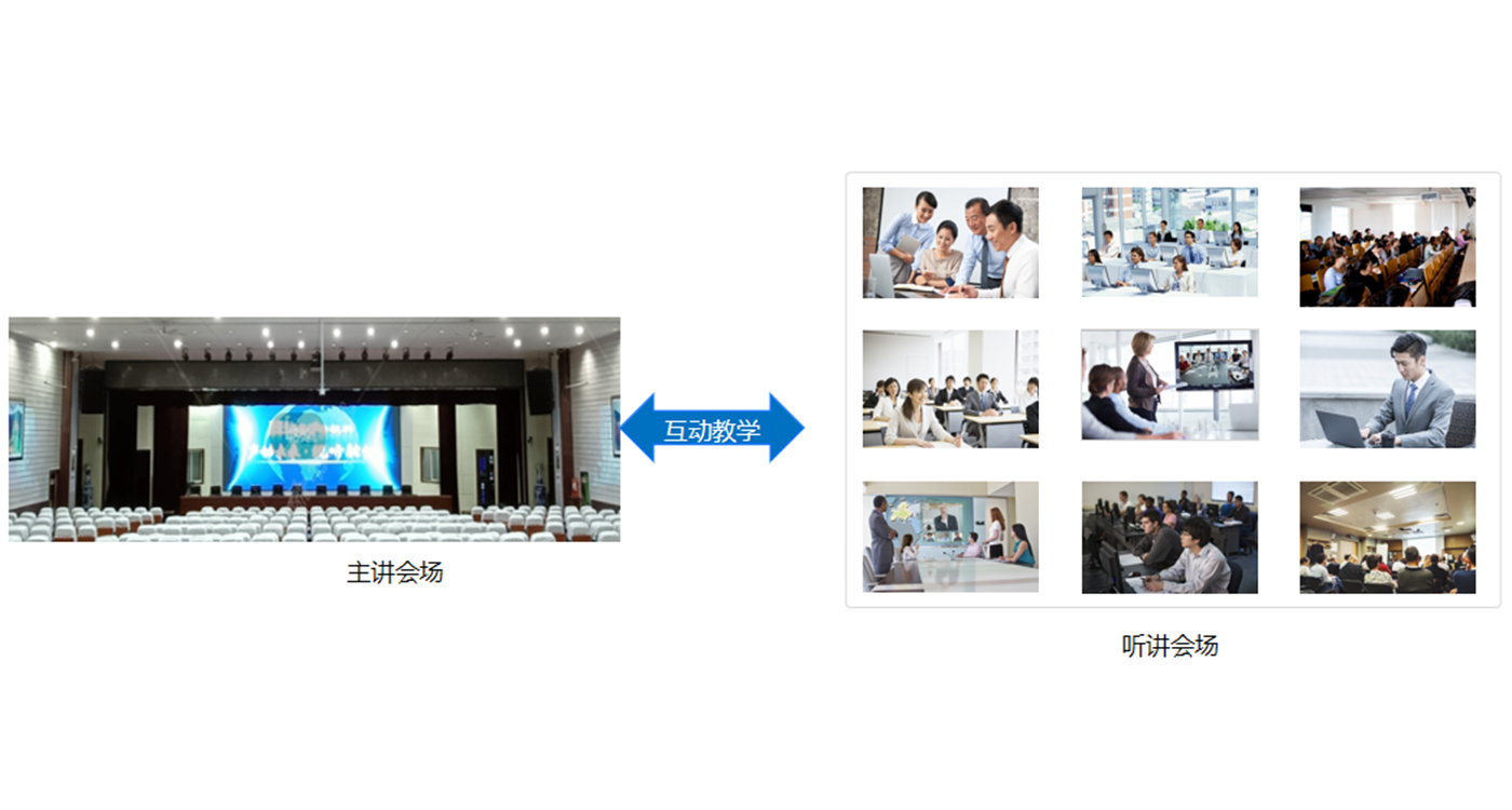 3) 远程培训,利用双流技术,可同时将主讲会场的授课人画面+教学课件文档传输到各听讲会场;听讲会场画面也可传输到主讲会场,实现双向的互动培训。
