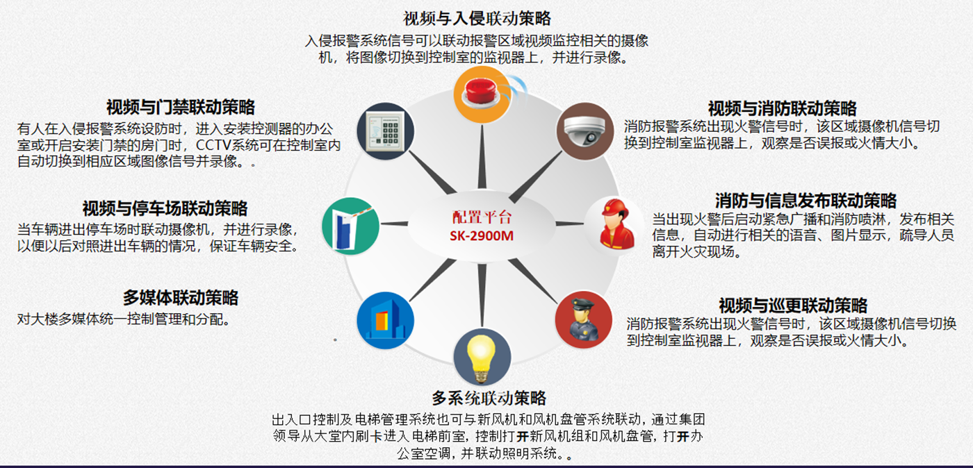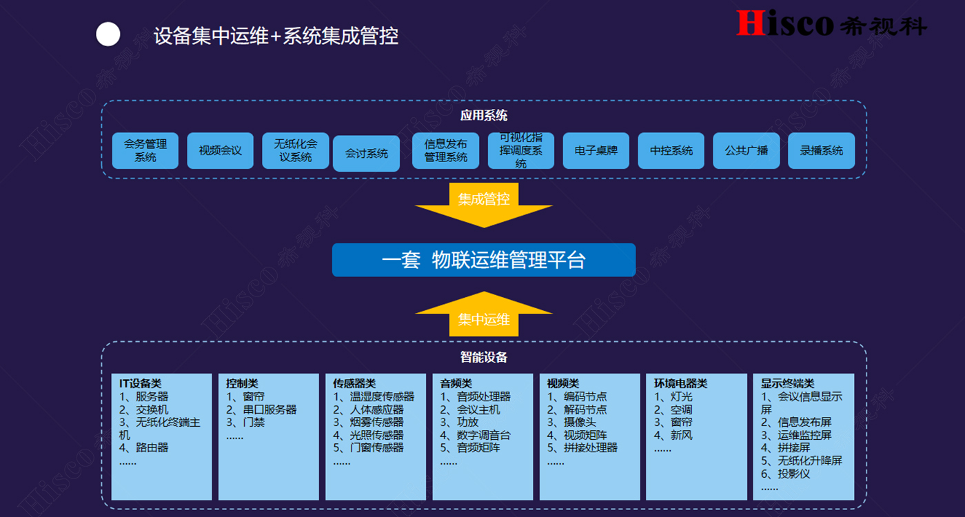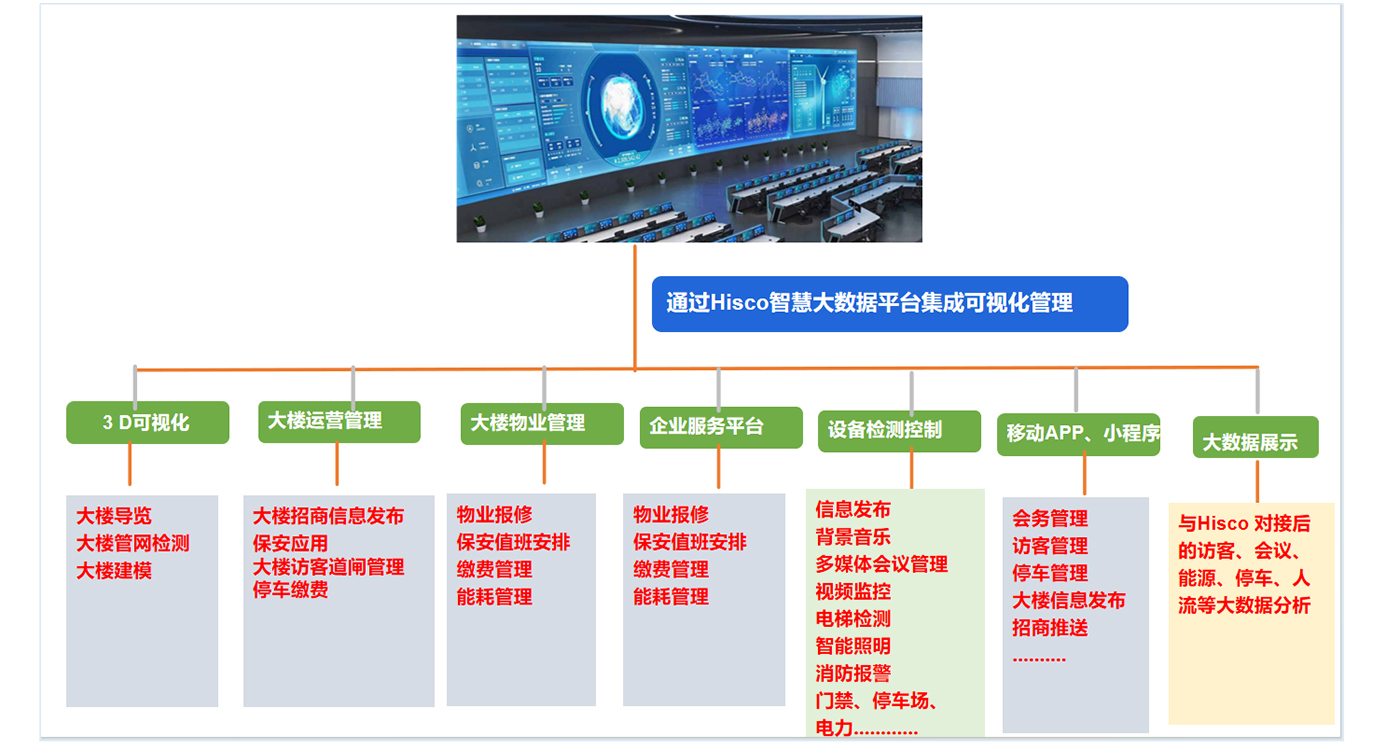 通过大数据网络平台,把建筑楼宇上各智能化、科技化的各系统进行管理,实现对各多媒体会务管理、会议设备的管理、高保真楼宇背景音乐、智能化照明、能耗控制、安防视频监控、安防门禁管理、防盗报警等各智能化系统做集中运维和可视化控制。