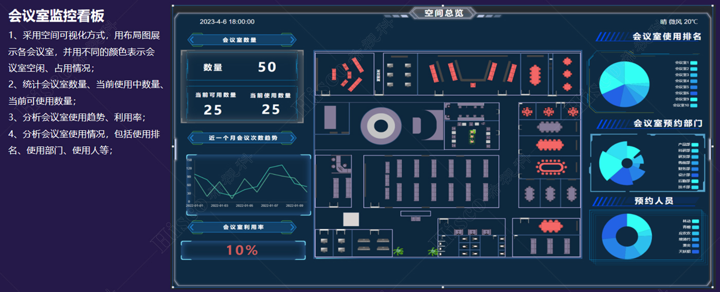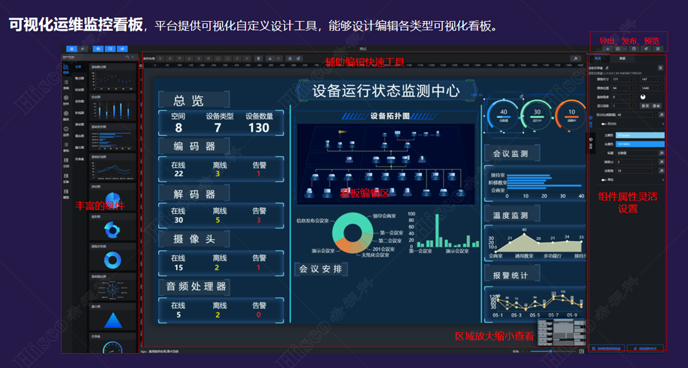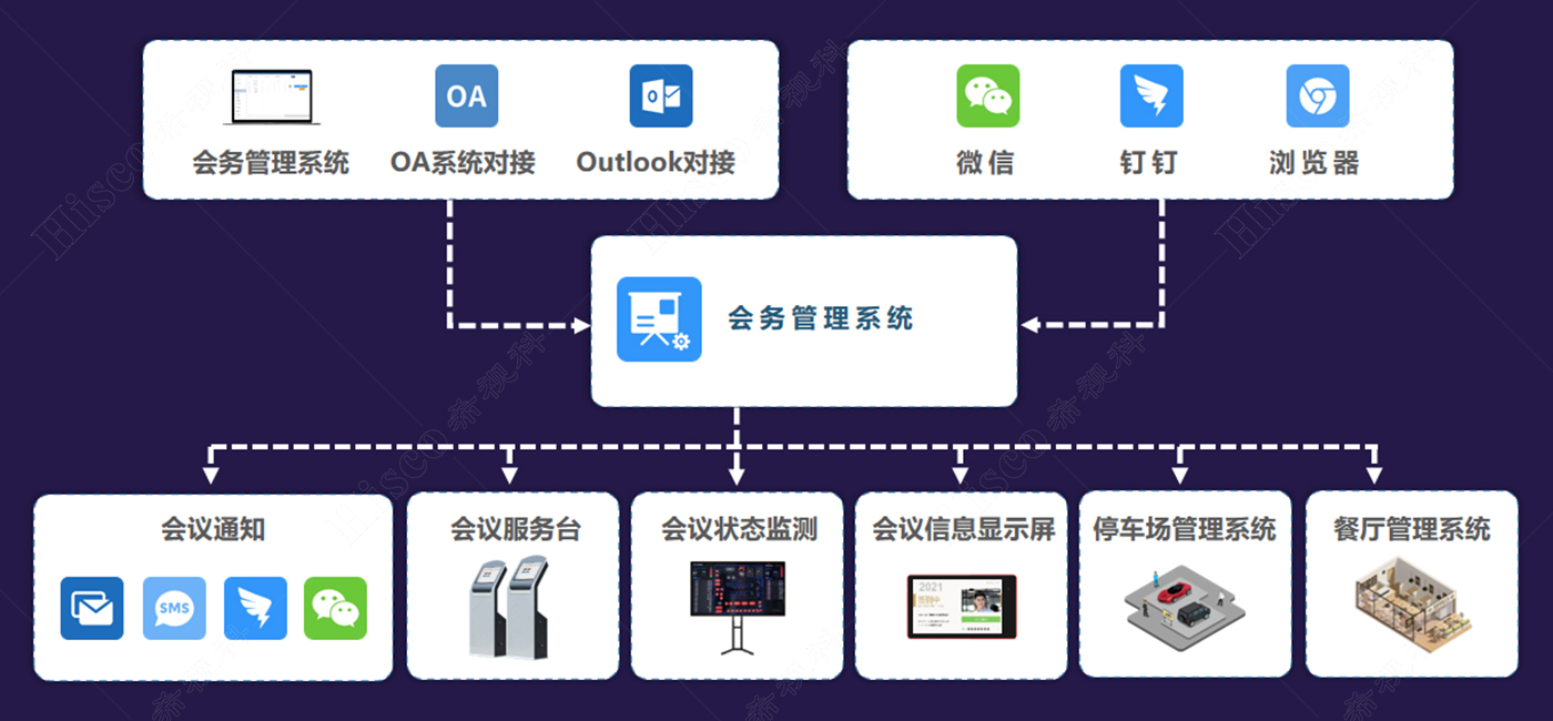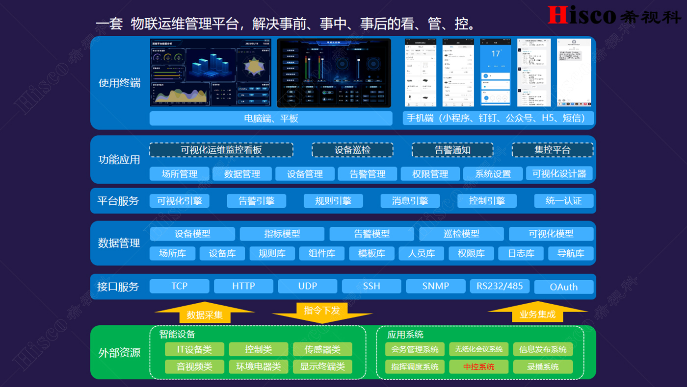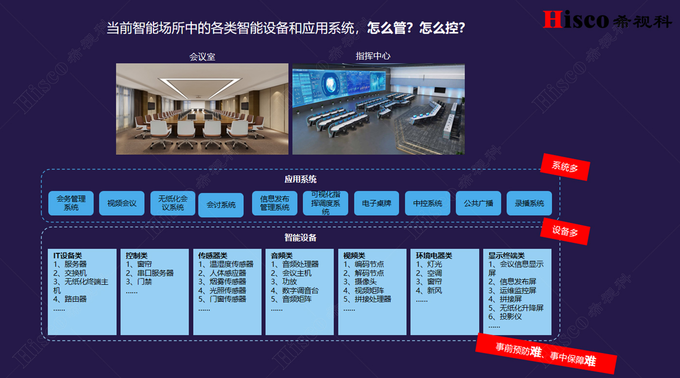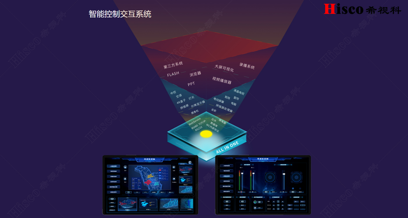 大楼智能化系统繁多,各系统通过Hisco大数据网络平台把各系统进行集中管理,实现对各多媒体会务管理、会议设备的管理、高保真楼宇背景音乐、智能化照明、能耗控制、安防视频监控、安防门禁管理、防盗报警等各智能化系统做集中运维和可视化控制,在大屏上实现交互对话。