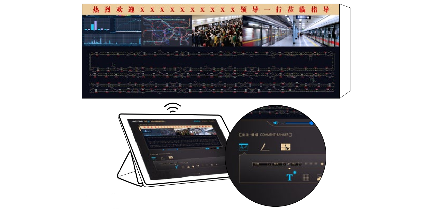 为提升指挥决策效率,满足指挥员对大屏显示内容进行快速交互的需要,快速将空间位置信息点与用户关注点相关联,突出重点、要点,分布式可视化管控系统支持大屏快速标注功能。标注功能支持通过操控终端在大屏显示的内容上进行快速标注,标注形式包括但不限于线条、图形、图例、图标等,为保证可突出在显示内容的基础上进行标示、标注,各类标注内容的颜色、大小、粗细等应可自由调整,从而提高指挥决策的,快速直观的传达、下发指令。