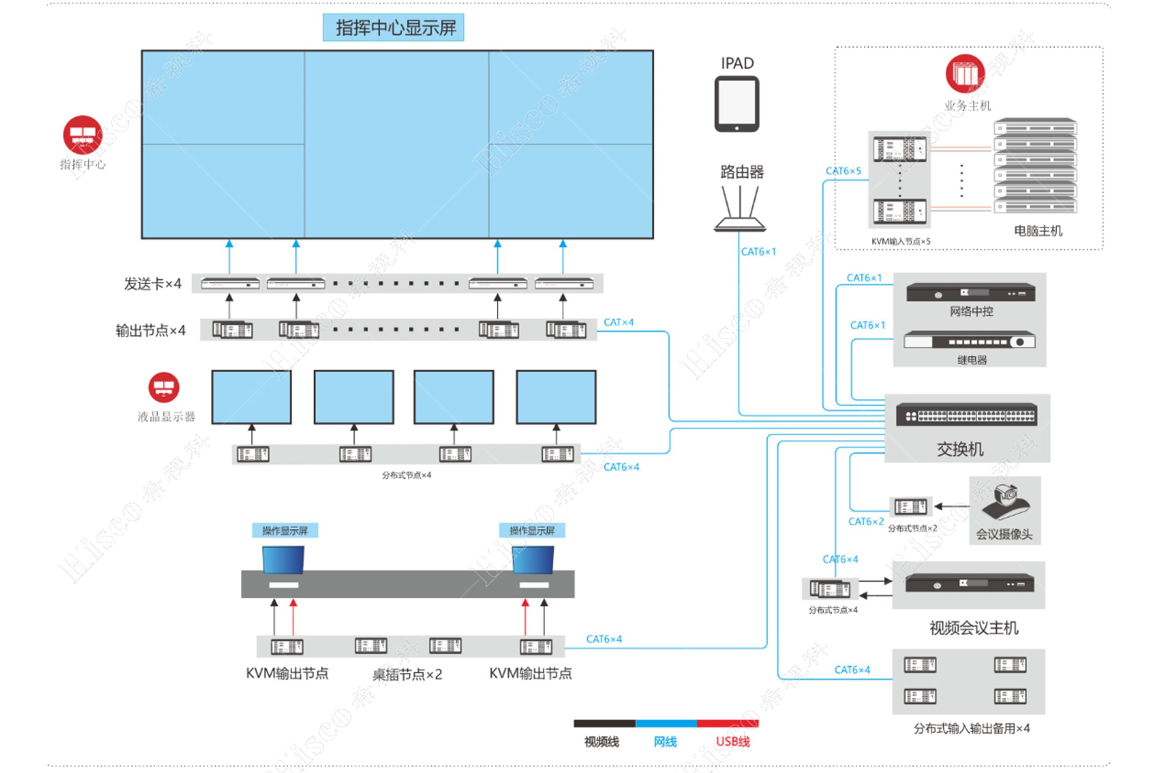 1.分布式节点通过交换机连接到分布式中控系统的分布式中控主机,通过总控制终端实现各类信号的控制,通过分布式控制系统对指挥运行中心的多种模式的设备一键开启与关闭;