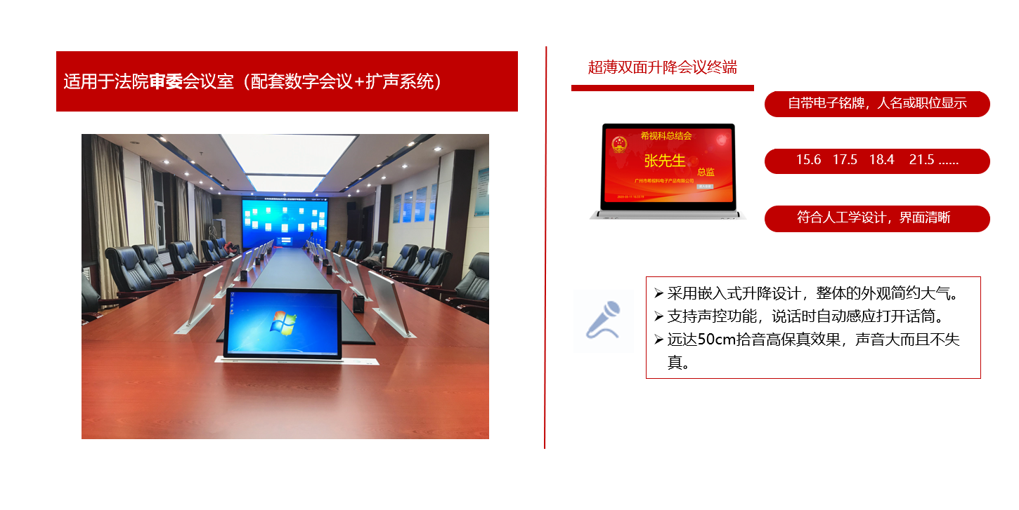 通过数字化会议室的规范化建设,为公检法单位的电子政务建设提供技术支持平台,提高公检法单位的统筹能力、协同能力。进一步提升工作质效,加强会议室管理,提高会议保密性。