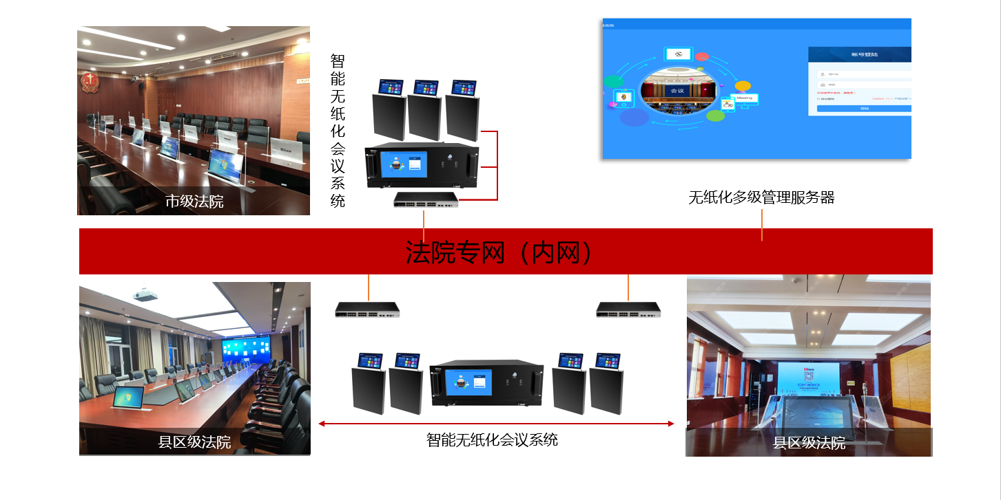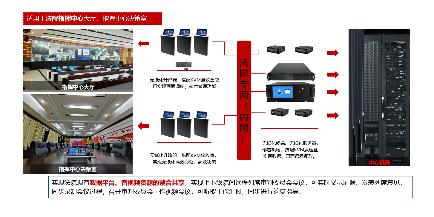 实现法院现有数据平台、音视频资源的整合共享,实现上下级院间远程列席审判委员会会议,可实时展示证据、发表列席意见,同步录制会议过程;召开审判委员会工作视频会议,可听取工作汇报,同步进行答复指导。