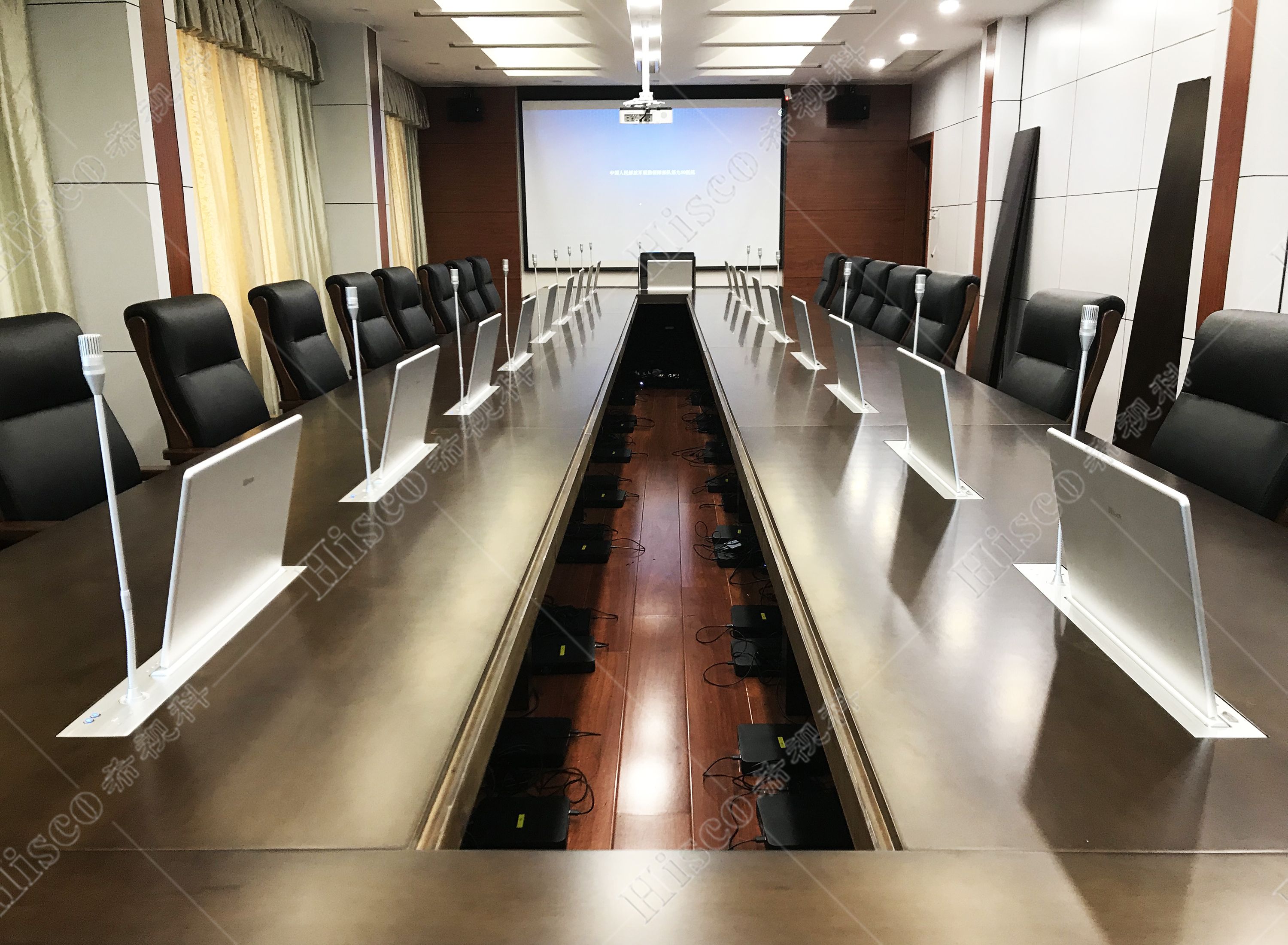 随着当今科技的飞速发展,老式的会议形式已无法适应现代化会议系统的要求。现代化的数字会议系统会议程序简单化、功能多样化,能够对会议实施控制、管理,包括声音传送稳定纯正,讨论清晰有序,使整个会议形式具有高效性。本次会议室设计采用数字会议系统,扩声系统、显示系统、集中控制系统、矩阵系统、无纸化升降等,实现会议室的多媒体会议功能,满足简洁流畅的会议过程、逼真传神的听觉效果、清晰舒适的视频显示、智能的摄像跟踪、媒体音视频信号源矩阵切换和中央集成控制等要求