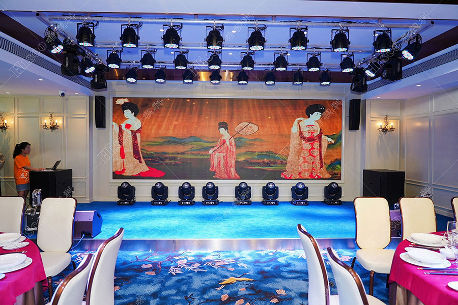本次宴会厅设计采用数字会议系统,扩声系统、显示系统、集中控制系统、矩阵系统、舞台灯光系统等,演出时采用左右立体声空间成像模式,直达声与辅助音箱的效果声相结合表演,传达表演意境,使得演员和观众之间产生一种无声的交流。
