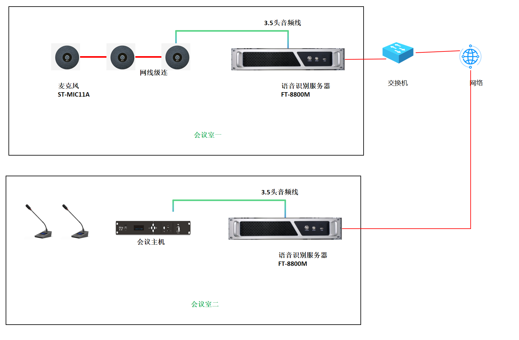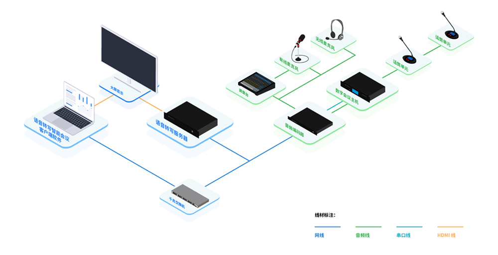 多会议室时配语音转写服务网络版,统一提供语音转写服务能力,支持多达32间会议室同时使用。每间会议室只需配备一台管理电脑和会议相关设备。