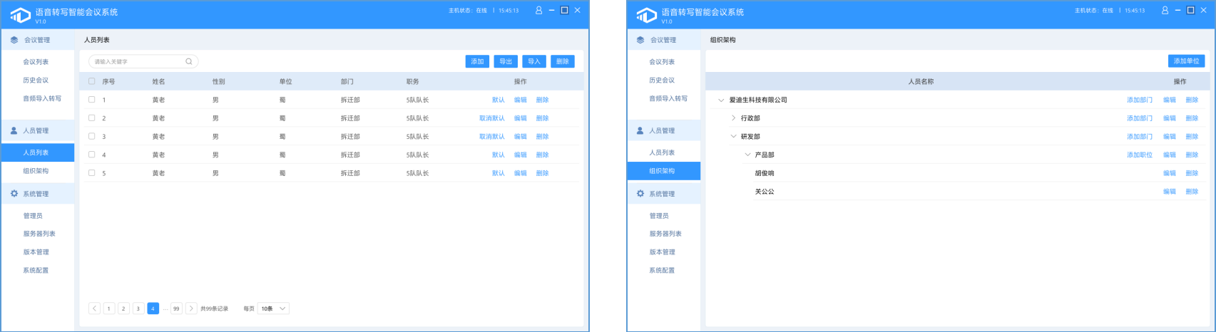 组织架构:三级组织架构功能,自定义单位、部门、职务。选择参会人员可按照组织架构排列选择。