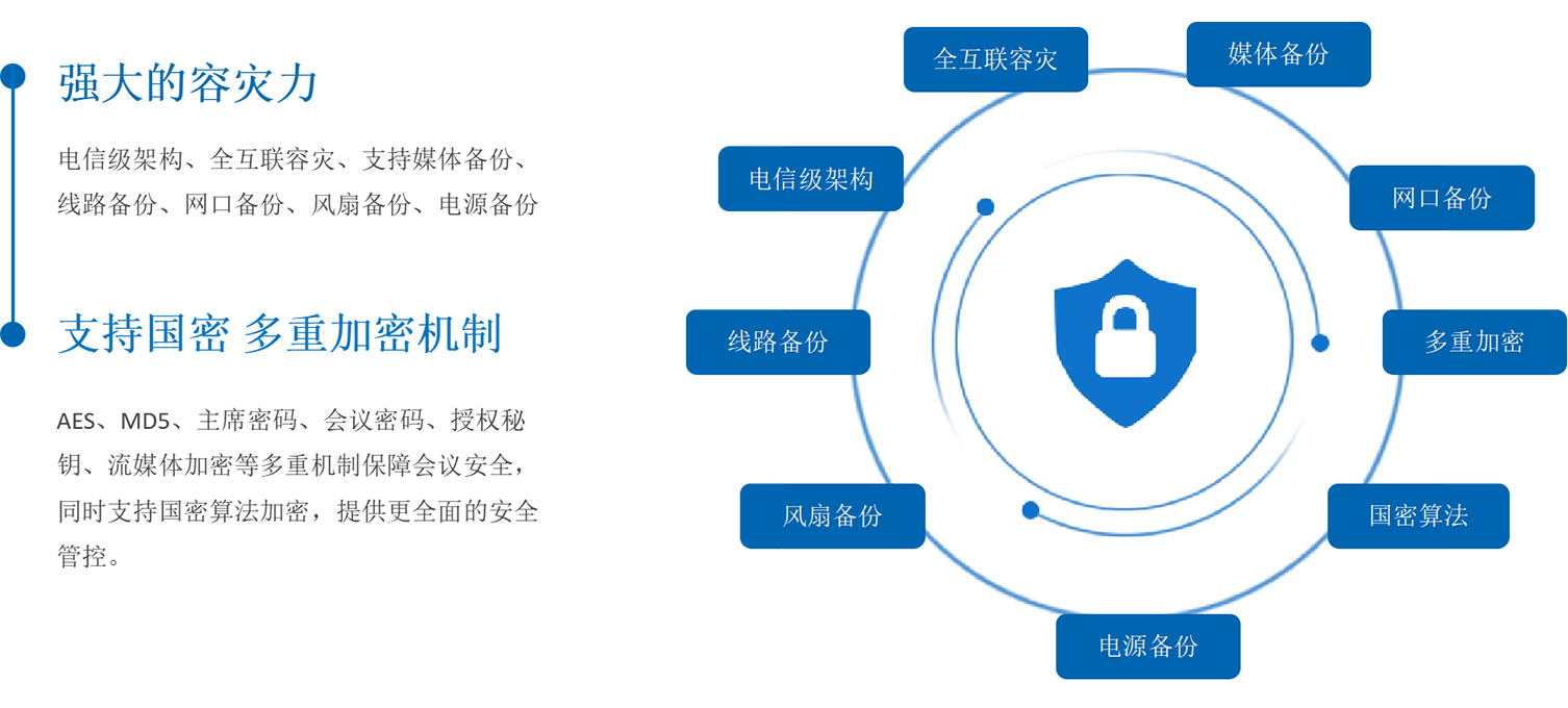 • AES、MD5、主席密码、会议密码、授权秘钥、流媒体加密等多重机制保障会议安全