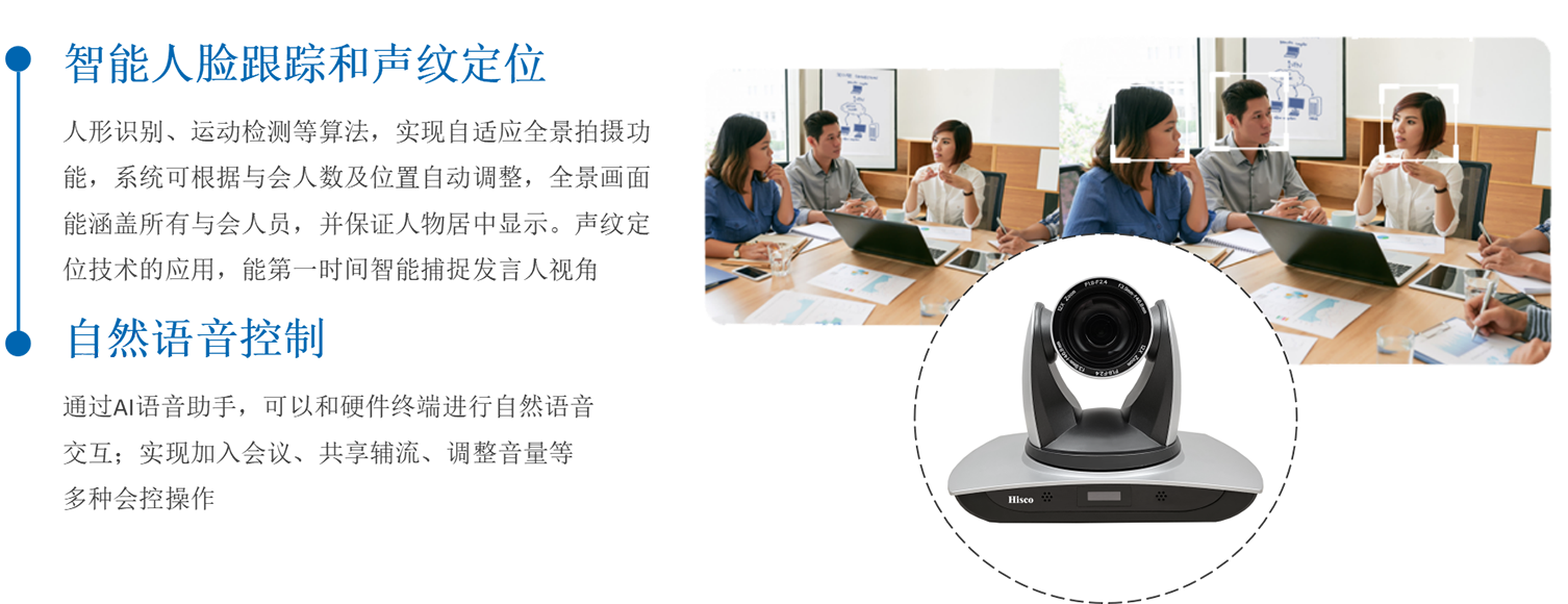 3)智能化会议:智能跟踪,自适应全景拍摄功能,声纹定位,智能捕捉发言人视角,支持自然语言交互、语音控制