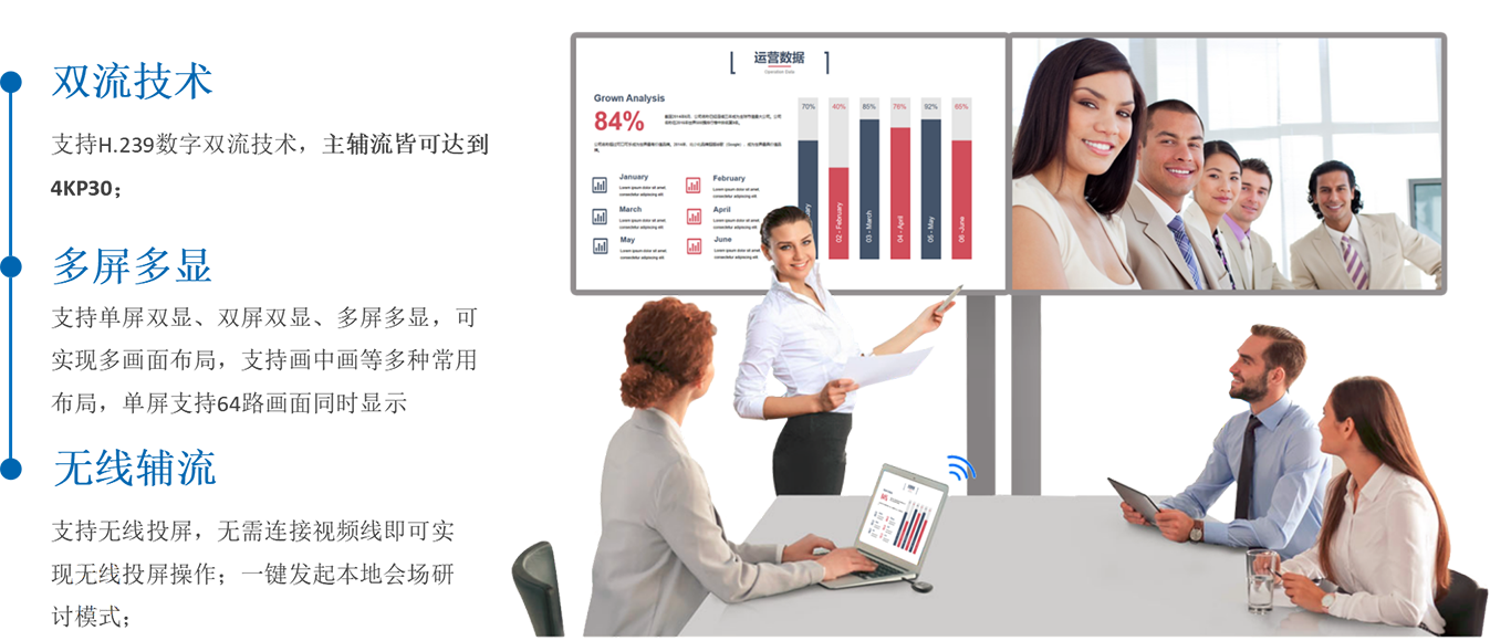 无线辅流:无需连接视频线,即可实现无线投屏操作,提供电子白板功能,在会议过程中可对会议文档资料进行批注解说,有效提高会议内容质量。