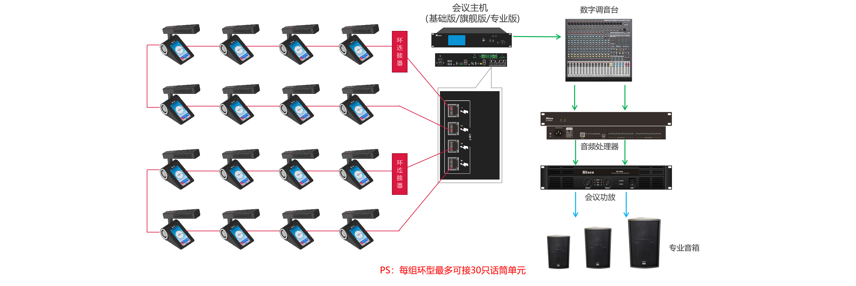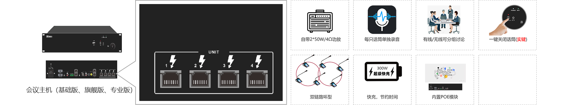1.大容量接入      2.一键关闭所有无线单元       3.消防联动       4.摄像跟踪       5.发言模式